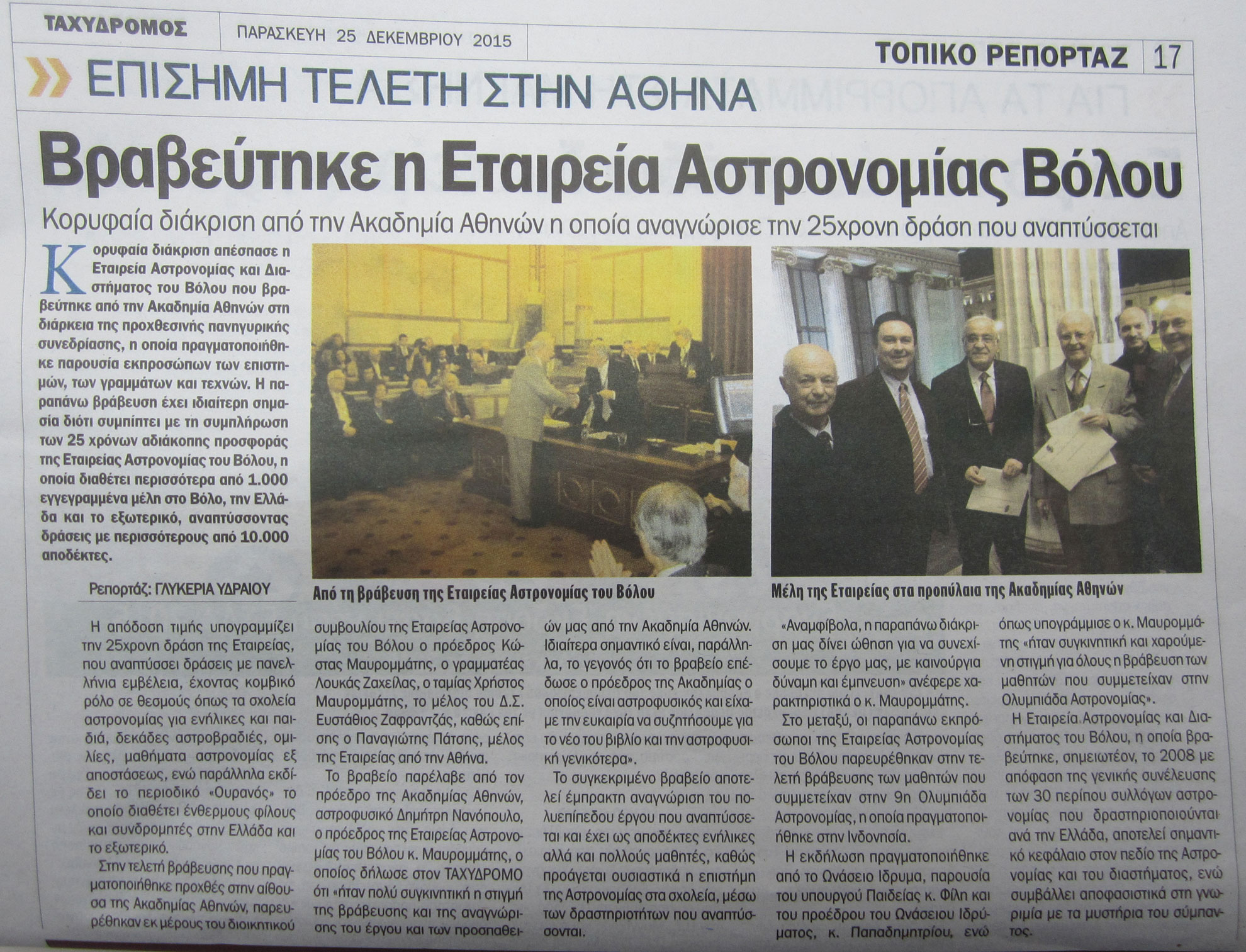 Σε επίσημη τελετή στην Αθήνα, παρουσία εκπροσώπων των επιστημών, γραμμάτων και τεχνών, βράβευτηκε η Εταιρεία Αστρονομίας και Διαστήματος. Κορυφαία διάκριση από την Ακαδημία Αθηνών η οποία αναγνώρισε την 25ετή δράση που αναπτύσσεται.