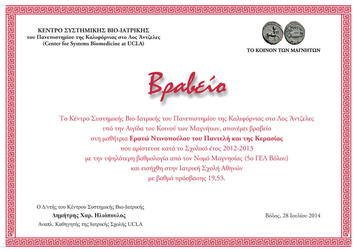 Απονομή βραβείου, από το Κέντρο Συστημικής Βιο-Ιατρικής του Πανεπιστημίου της Καλλιφόρνιας στο Λος Άντζελες (UCLA) στην αριστούχο μαθήτρια από το Νομό Μαγνησίας Ερατώ Ντινοπούλου, που εισήχθη μεταξύ των πρώτων στην Ιατρική Σχολή του Πανεπιστημίου Θεσσαλονίκης. Το βραβείο προσφέρει ο Αν. Καθηγητής Δημήτρης Ηλιόπουλος, Δ/ντής του εν λόγω Κέντρου και μέλος του «Κοινού των Μαγνήτων».