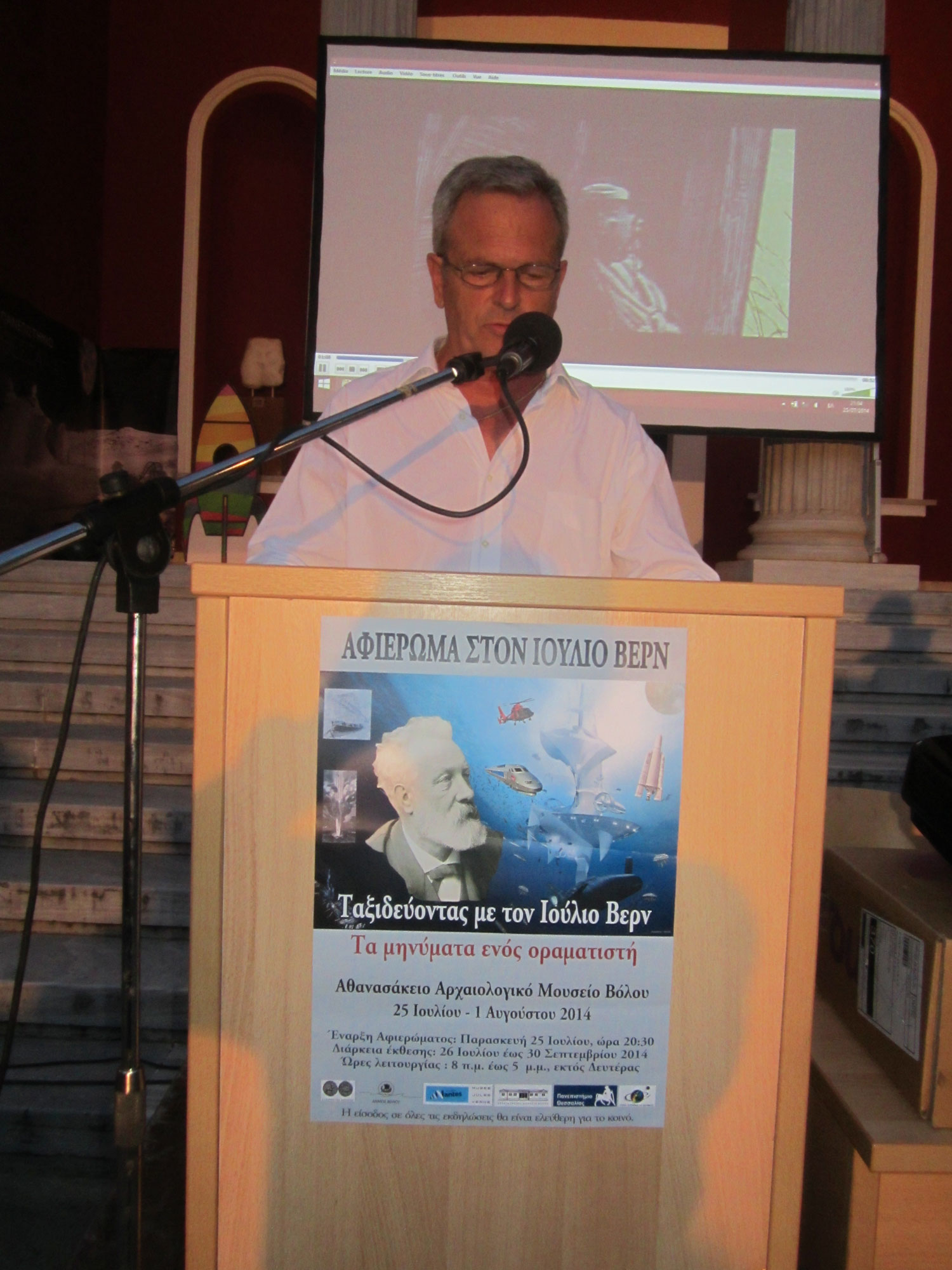 Aγαπητέ κε Βουλευτά, αγαπητέ κε Δήμαρχε Βόλου, αγαπητέ κε Πρύτανη, αγαπητοί συμπολίτες, σας ευχαριστούμε θερμά που μας τιμάτε με την παρουσία σας σήμερα, στην εναρκτήρια εκδήλωση του αφιερώματος στο μεγάλο Γάλλο συγγραφέα Ιούλιο Βερν, που το «Κοινόν των Μαγνήτων», σε συνεργασία με το Δήμο Βόλου, την ΙΓ΄Εφορεία Προιστορικών και Κλασικών Αρχαιοτήτων, το Πανεπιστήμιο Θεσσαλίας, την Εταιρεία Αστρονομίας και Διαστήματος καθώς και με τις τοπικές αρχές στη Νάντη,τη γενέτειρα του ΙΒ, διοργανώνει στον υπέροχο αυτό χώρο του Αρχαιολογικού Μουσείου.