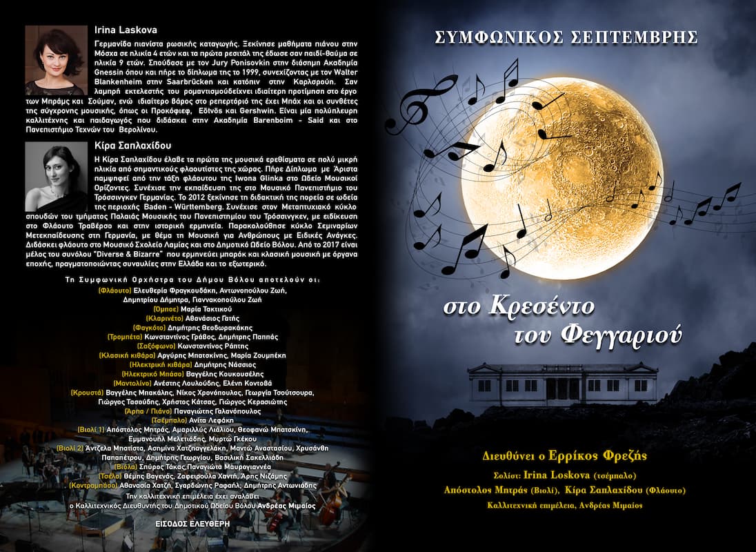 Έτσι την ερχόμενη Παρασκευή με το φως του φεγγαριού η συναυλία της Συμφωνικής Ορχήστρας Βόλου, υπό τη διεύθυνση του Ερρίκου Φρεζή θα παρουσιάσει ένα ιδιαίτερα διαμορφωμένο πρόγραμμα με έργα συμφωνικής μουσικής και μουσικής Δωματίου σε ένα μουσικό ταξίδι από την Μπαρόκ εποχή μέχρι και τις μέρες μας.